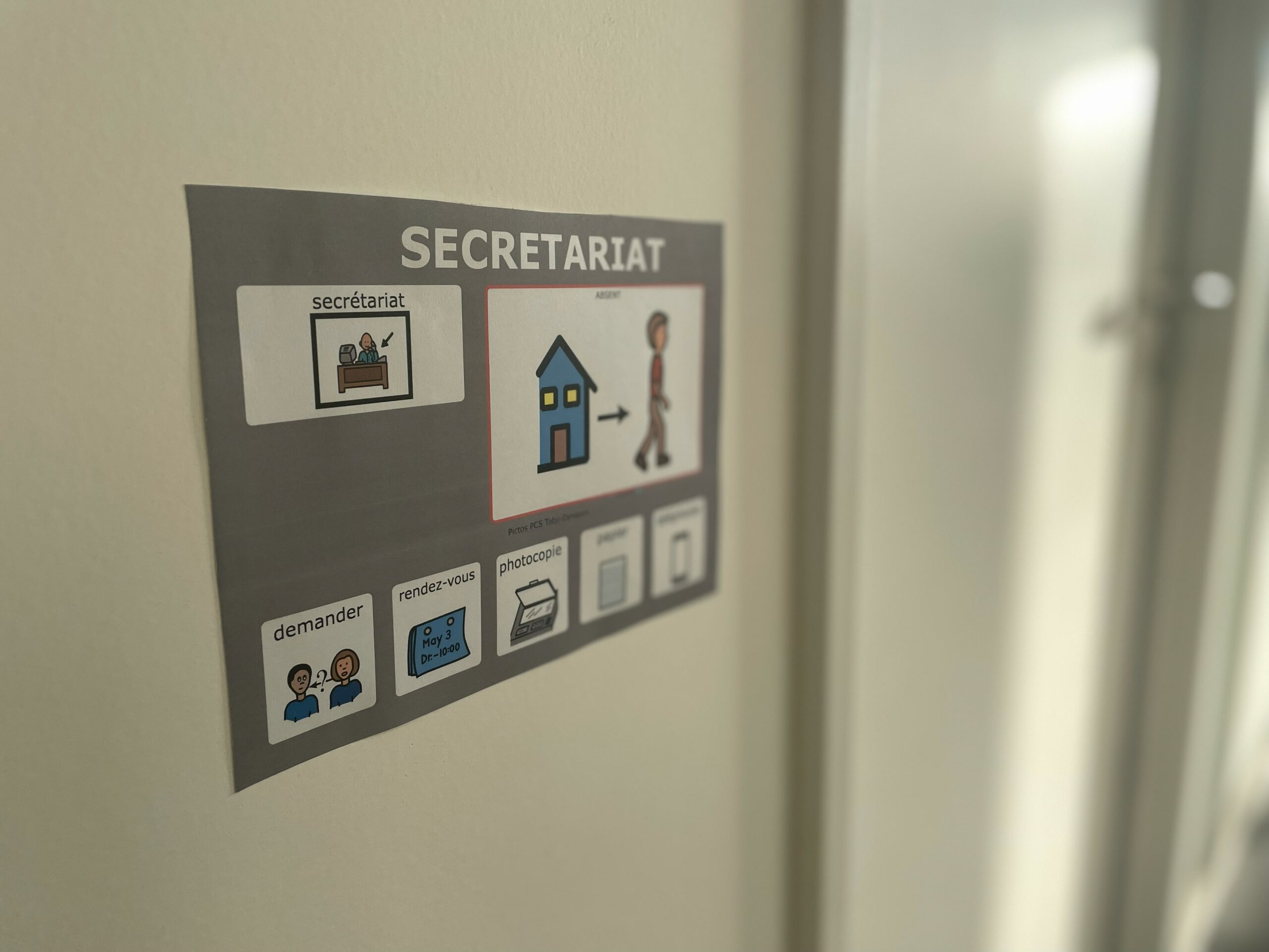 Les illustrations contextuelles, en lien direct avec les usages spécifiques du lieu, renforcent considérablement la compréhension. Par exemple, sur la porte d’un bureau administratif, il sera plus pertinent de représenter ce que l’on peut y faire — parler avec un interlocuteur, attendre, signer un document — plutôt que de se contenter d’une mention générique « Bureau ». Dans une salle Snoezelen, les pictogrammes pourront évoquer le fait de se détendre, d’écouter, de se reposer. Dans un espace collectif de restauration, les représentations montreront des personnes en train de manger, d’échanger, de se retrouver.