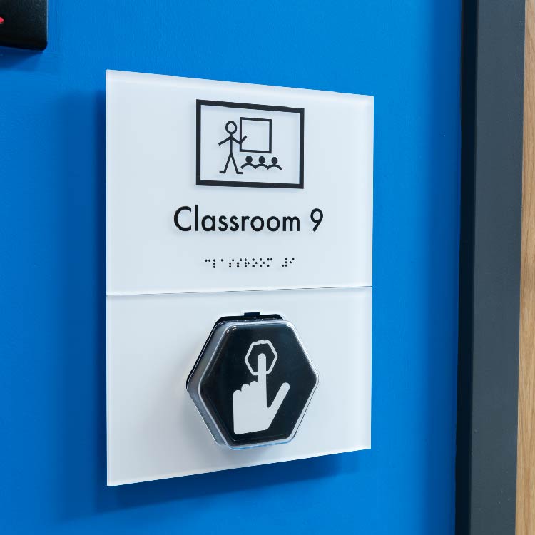 Pour les personnes aveugles ou malvoyantes, la lisibilité passe également par des dispositifs tactiles. Le braille et les lettres en relief permettent une lecture par le toucher. La signalétique en braille doit être positionnée à une hauteur comprise entre 90 et 130 cm pour être accessible. Elle gagne à être placée de manière repérable, par exemple proche des poignées de portes (hôtels, bureaux) ou sur le bout des mains courantes (escaliers). Il est recommandé d’utiliser des plaques en relief positif et braille, qui peuvent être comprises à la fois par les personnes voyantes et non-voyantes, évitant ainsi la multiplication des supports.