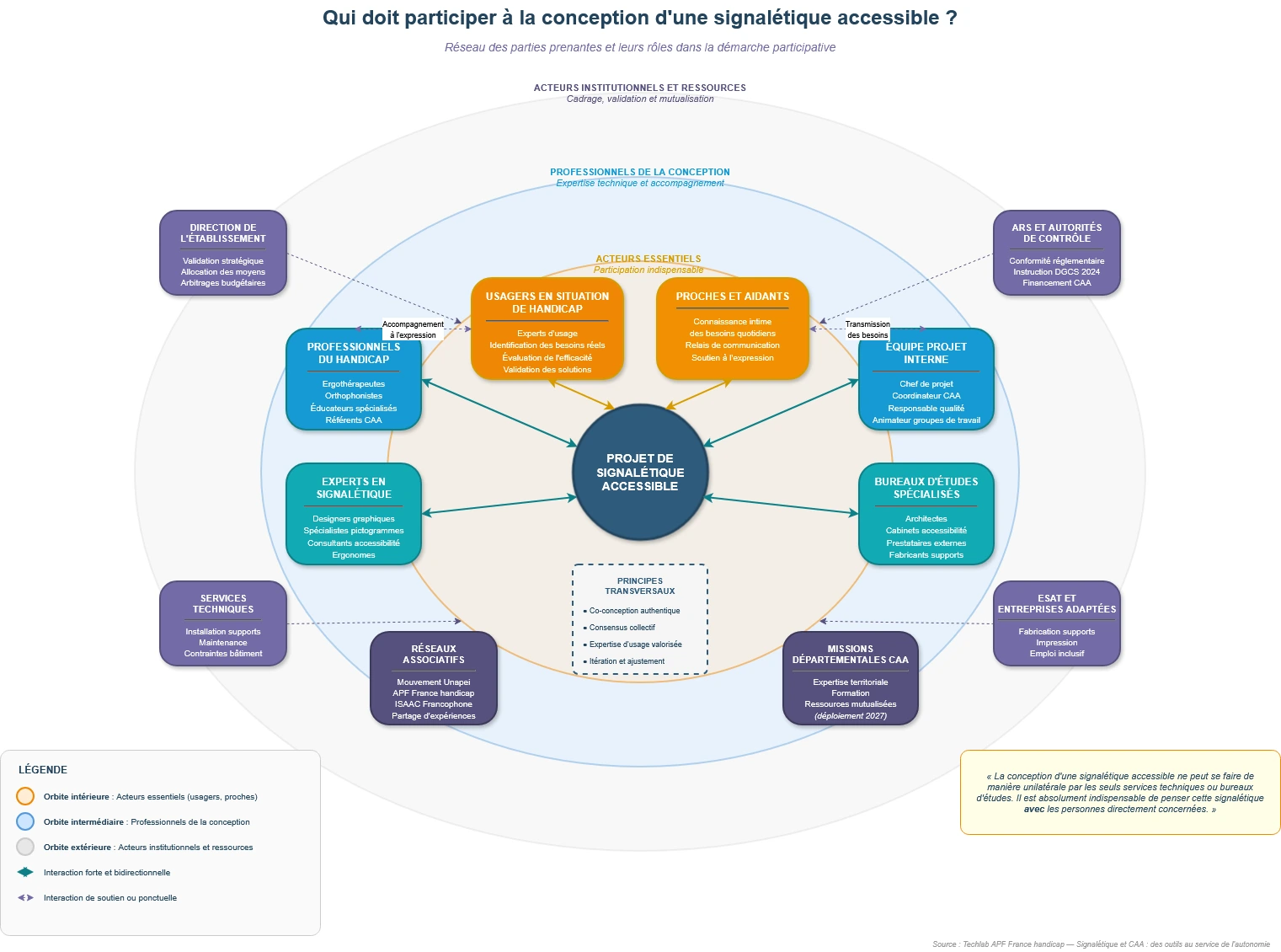 Sa conception nécessite une démarche participative authentique, associant les personnes concernées à toutes les étapes du projet. Les solutions techniques retenues doivent respecter les principes de cohérence, de clarté et d’accessibilité multi-sensorielle, tout en s’adaptant au contexte spécifique de chaque établissement.
