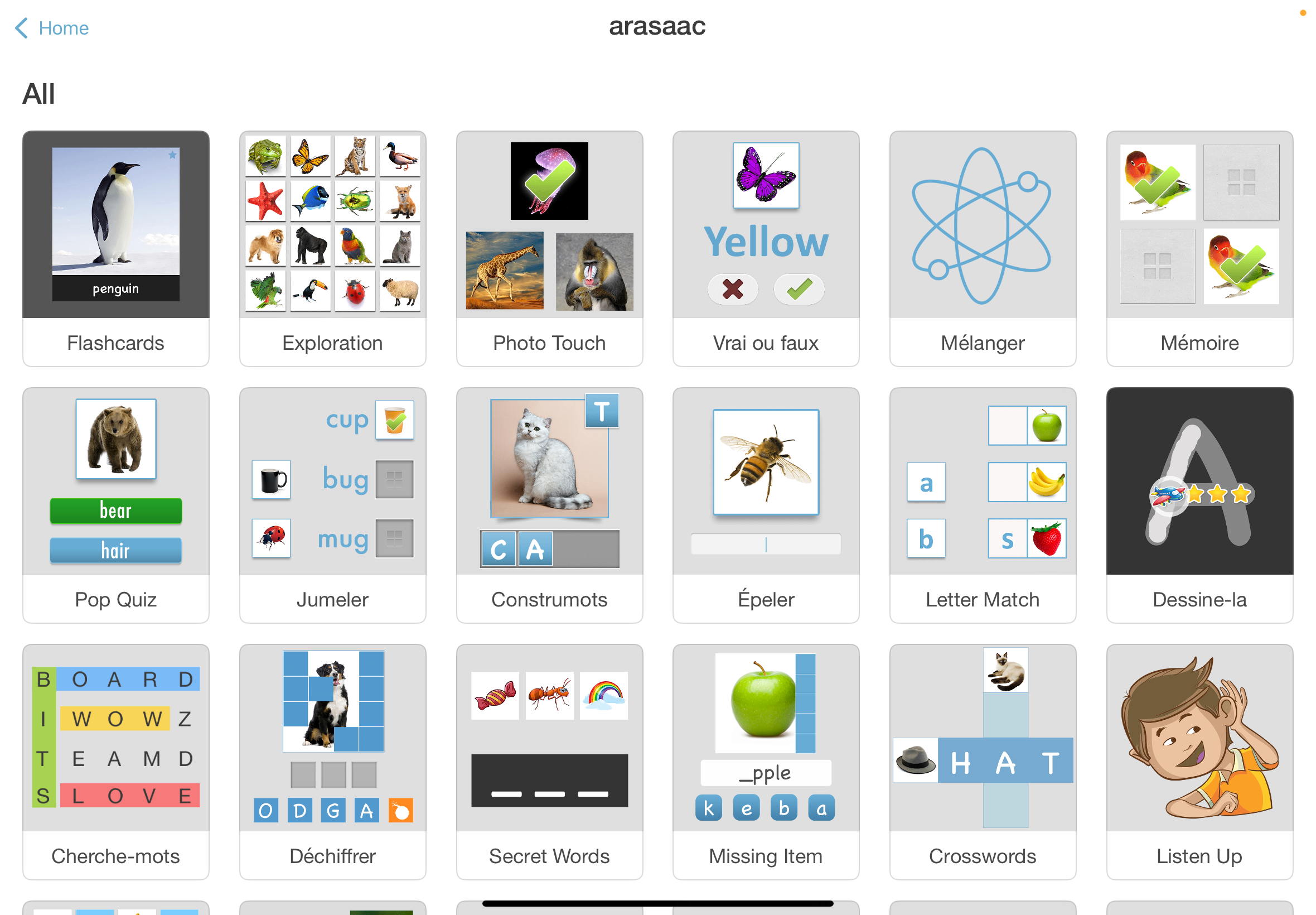 À partir de chaque imagier, l’appli génère automatiquement 29 types de jeux et exercices différents, tous paramétrables :