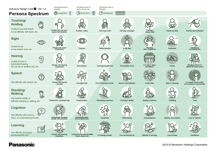 Cet outil, créé par Panasonic, a été conçu pour aider les équipes à réfléchir de manière inclusive en partant d’une situation individuelle et en l’élargissant à un spectre plus large. Il s’appuie sur le concept de « Persona Spectrum », qui consiste à regrouper des expériences similaires liées à des limitations physiques, sensorielles ou contextuelles. L’objectif est de transformer une idée pensée pour une personne en une solution qui bénéficie à beaucoup plus de monde, en tenant compte des handicaps permanents, des limitations temporaires et des conditions environnementales.