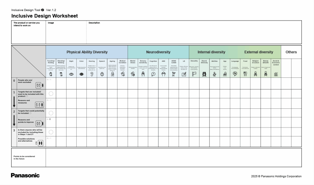 Cette feuille de travail a été créée par Panasonic pour aider les équipes à élargir leur perspective lors du développement de produits ou services. Elle encourage à identifier les besoins et points de vue qui sont souvent négligés, en explorant la diversité des utilisateurs (physique, cognitive, contextuelle). L’objectif est de reconnaître les exclusions involontaires et de générer des idées qui rendent les solutions plus inclusives pour tous.